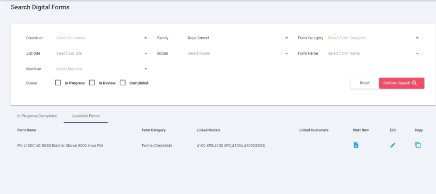 In Progress/Completed – Forms which have some or all information and have been assigned to an equipment